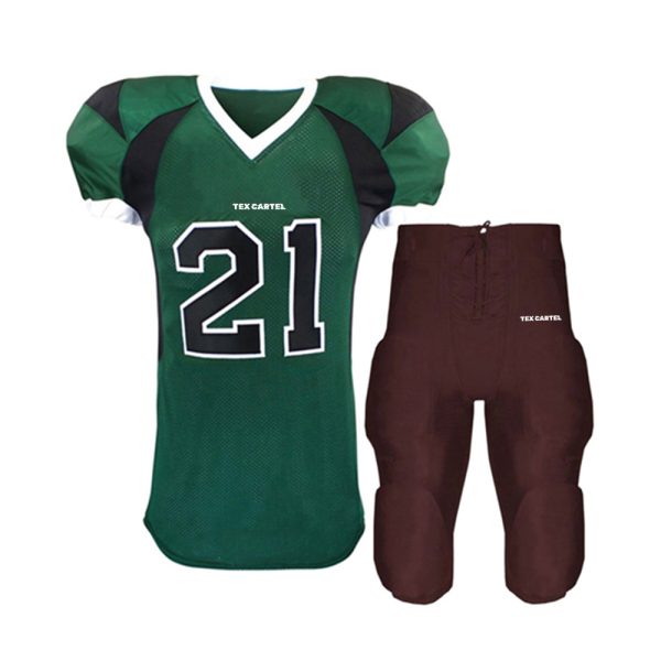 An American football uniform is built for comfort, performance, and protection. It features a breathable jersey with the player’s number for easy identification. Padded pants protect the thighs, hips, and knees during gameplay. A helmet with a face mask and shoulder pads ensures safety. Sturdy cleats provide grip and stability on the field.